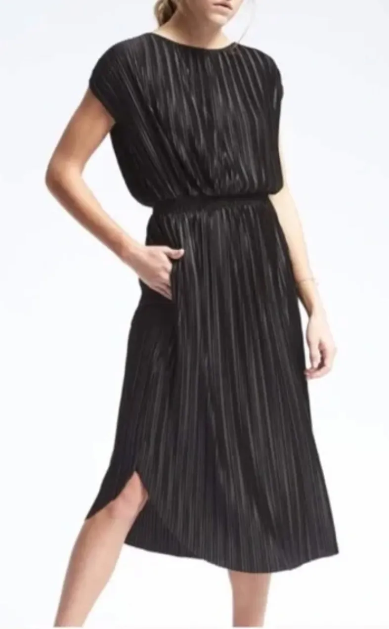 A chic Banana Republic black midi dress featuring elegant pleats throughout and cap sleeves. This dr... Show more