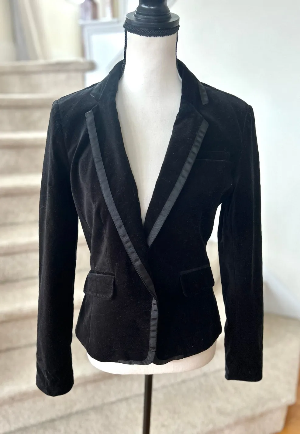 Excellent condition. Vintage Banana Republic factory, black velvet with ribbon trim tuxedo style. Si... Show more
