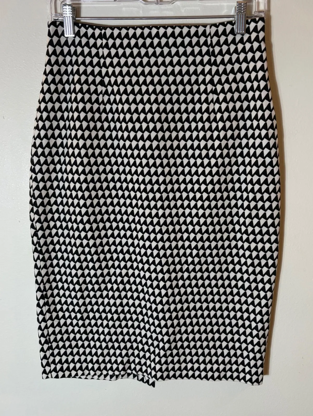 A sophisticated black and white geometric print pencil skirt. This skirt offers a flattering silhoue... Show more