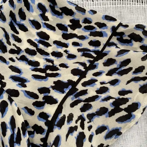 Silky blue and black cheetah print blouse with ruffled sleeves. Size medium. Some small imperfection... Show more