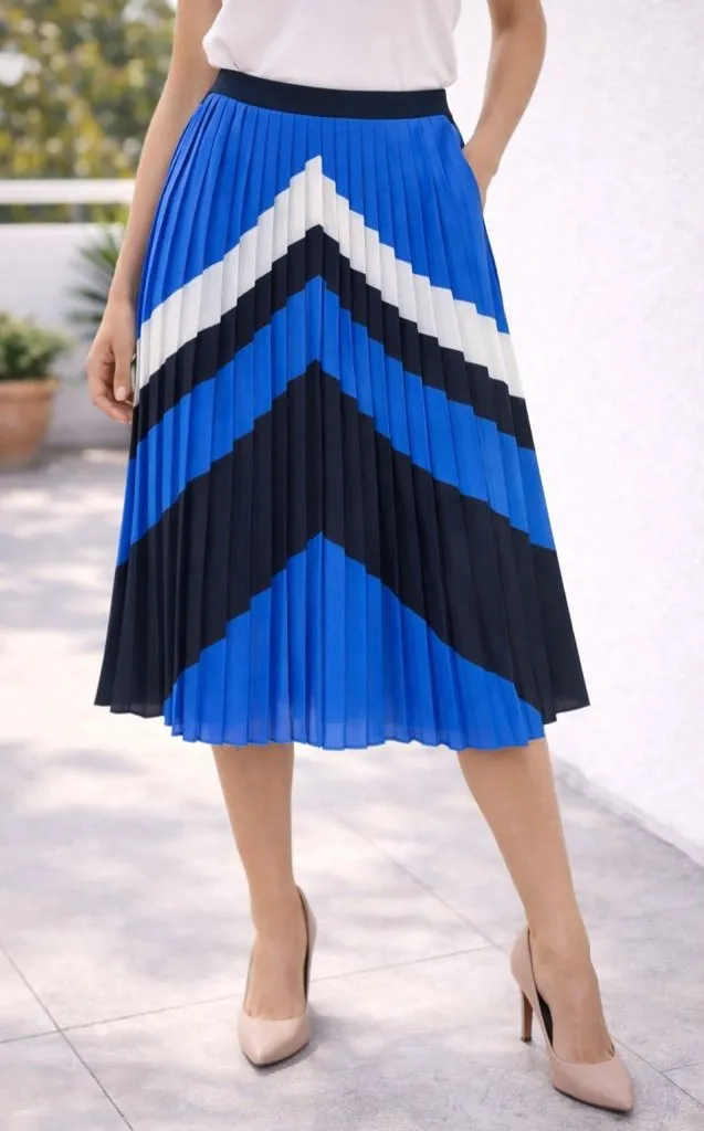Chic Banana Republic pleated midi skirt featuring a bold blue, navy, and white chevron pattern. Desi... Show more
