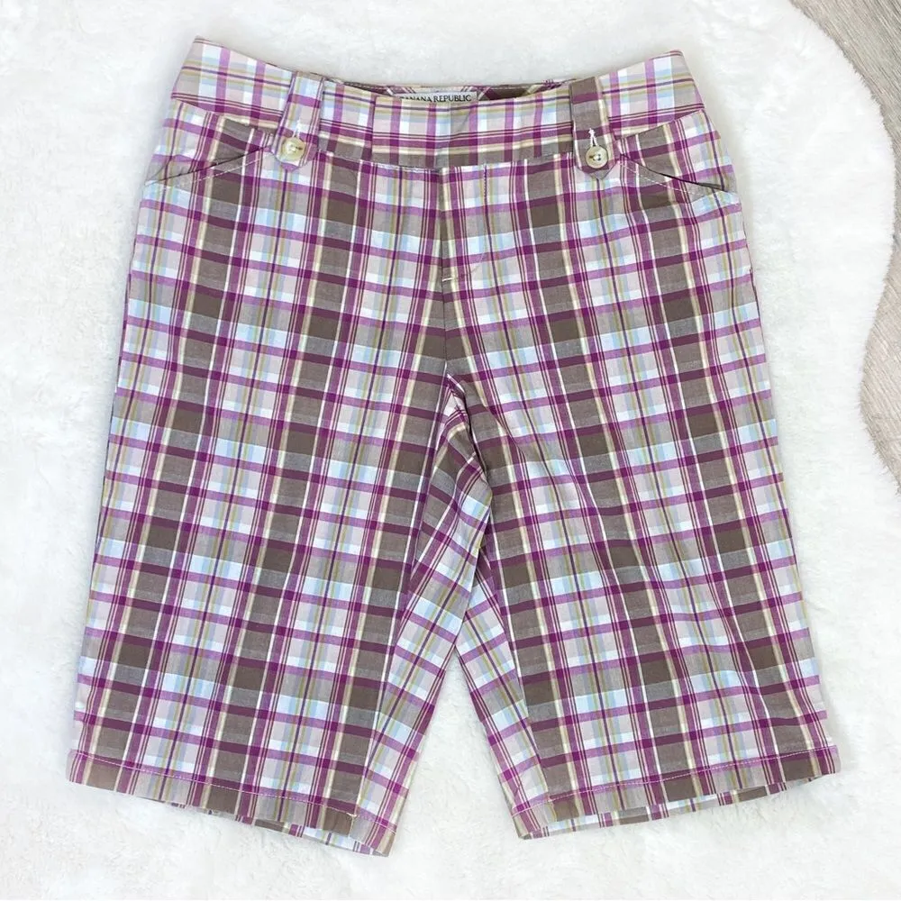 Banana Republic Factory Martin Fit Plaid Bermuda Shorts Size 0 Multicolor purple, tan & white wi... Show more