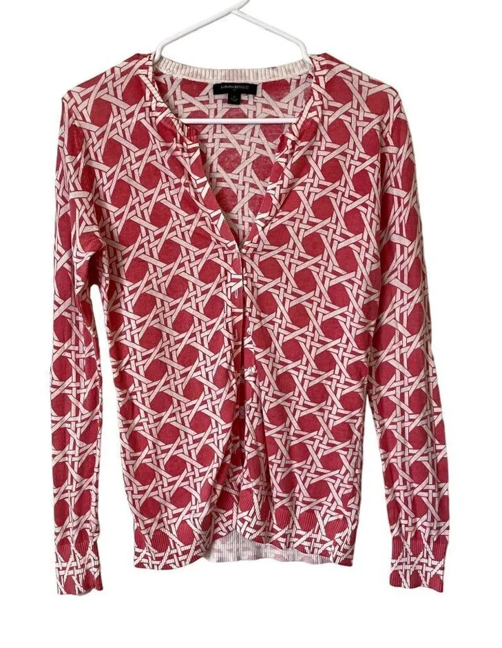 A red and white long sleeved cardigan with buttons and a geometric design. Labeled a women's size me... Show more
