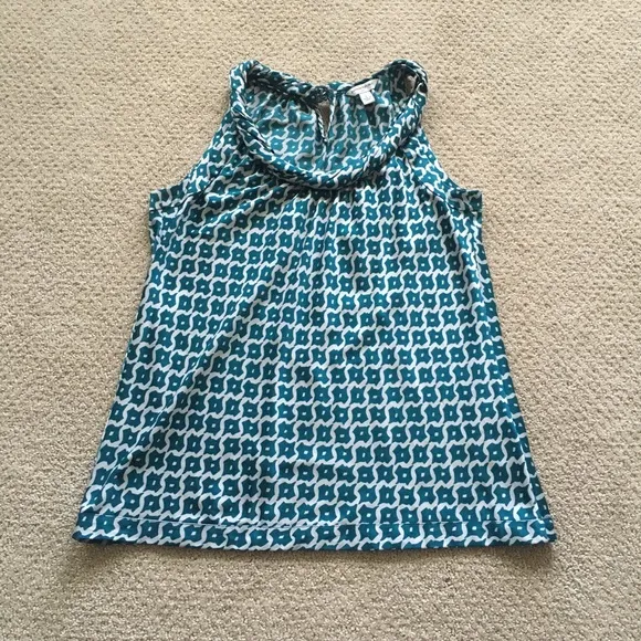 100% Polyester Tealish color Received MANY compliments on this tank Goes perfectly with white jean... Show more
