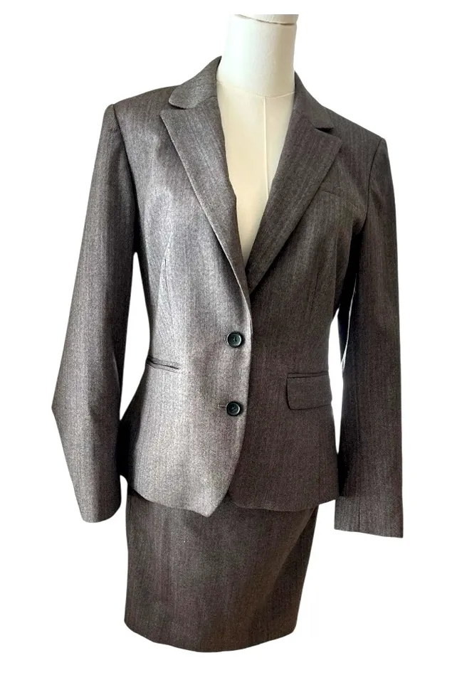 2-piece suit, skirt suit, blazer and skirt set, business casual, careerwear, interview outfit, office outfit, workwear, professional clothing, neutral tones, timeless style, petite fashion, structured blazer, Banana Republic, herringbone pattern, women’s business suit, corporate fashion, wardrobe essential