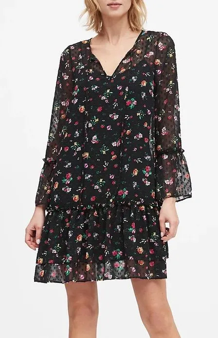 Banana Republic black floral dress with clip-dot and floral design with flounce ruffle hem and long... Show more