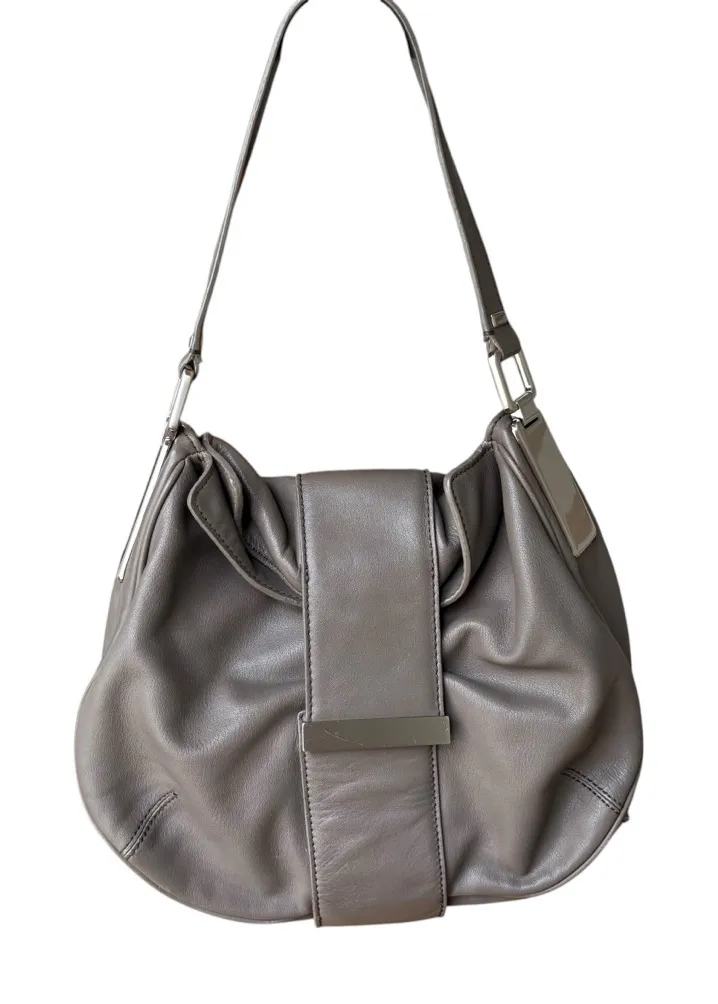This elegant taupe leather shoulder bag is perfect for any occasion. Its sleek design and neutral co... Show more