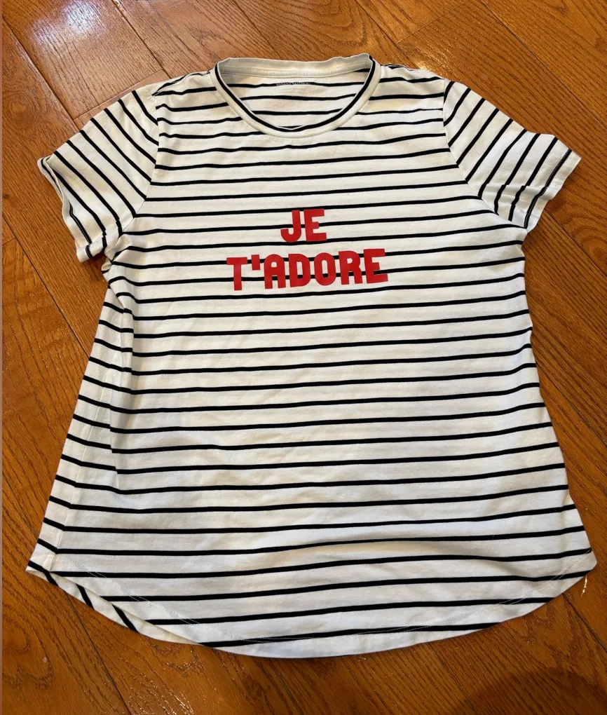 Chic Banana Republic “JE T’ADORE” striped tee in excellent used condition. White with black stripes... Show more
