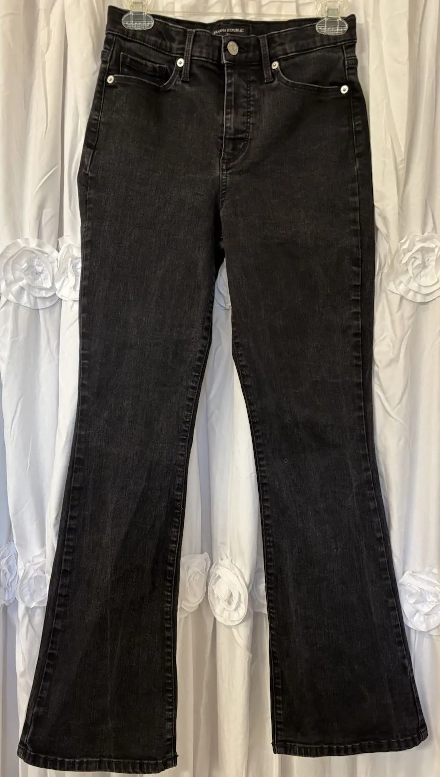The product is a pair of Banana Republic women's slim flare high rise black jeans in size 26P. Made... Show more