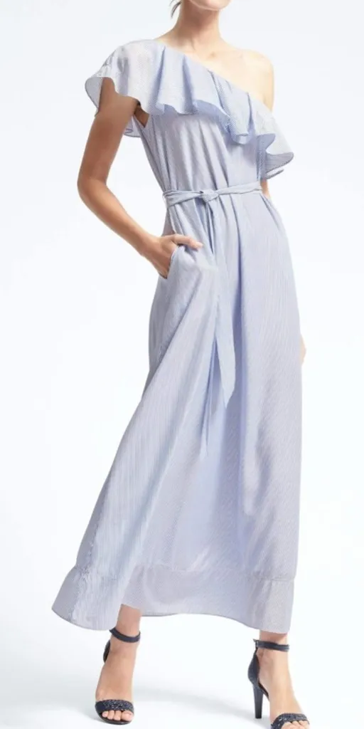 Elegant one-shoulder dress with ruffle detail. Light blue hue. Includes waist tie for a flattering f... Show more