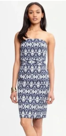 Banana Republic Navy Blue Ikat Strapless Dress ~ influencer loved, this Strapkess dress features a... Show more