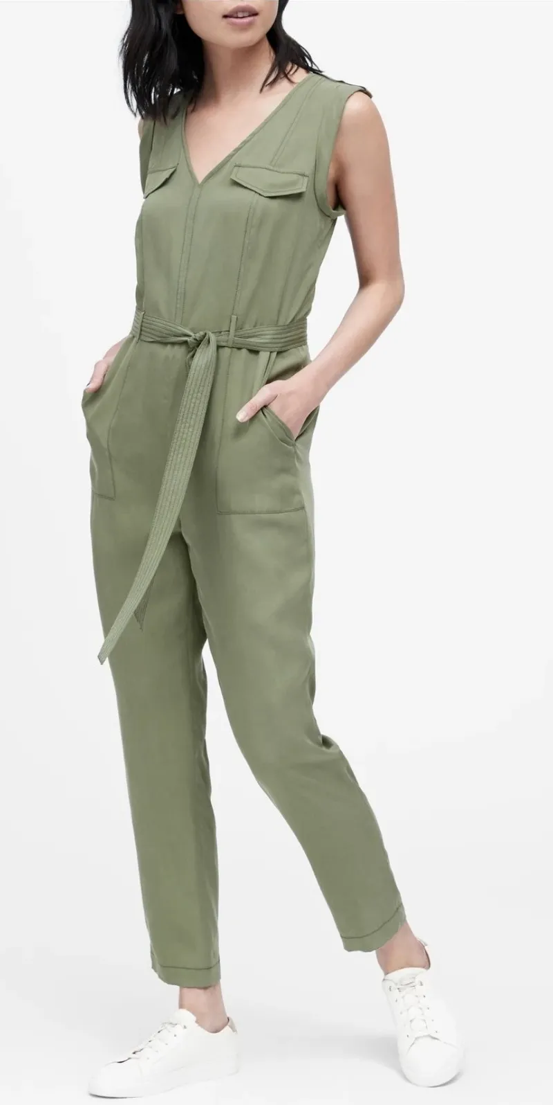 Keywords: Banana Republic, jumpsuit, olive green, sleeveless, belted, utility, pockets, casual, chic, womens, size 4, V-neck, one piece, romper