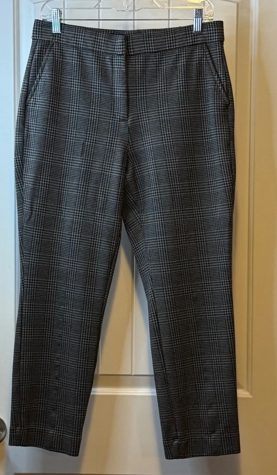 Keywords: Banana Republic pants, plaid trousers, women's career pants, slim leg pants, ankle pants, tailored pants, business casual, sophisticated style, classic plaid, workwear, office attire, fall fashion, designer pants, petite trousers