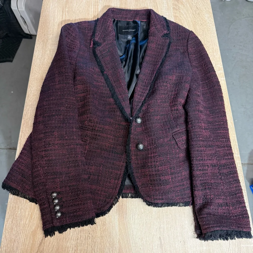 Stylish maroon tweed blazer with black trim. Features button closure and fringe detailing. Ideal for... Show more