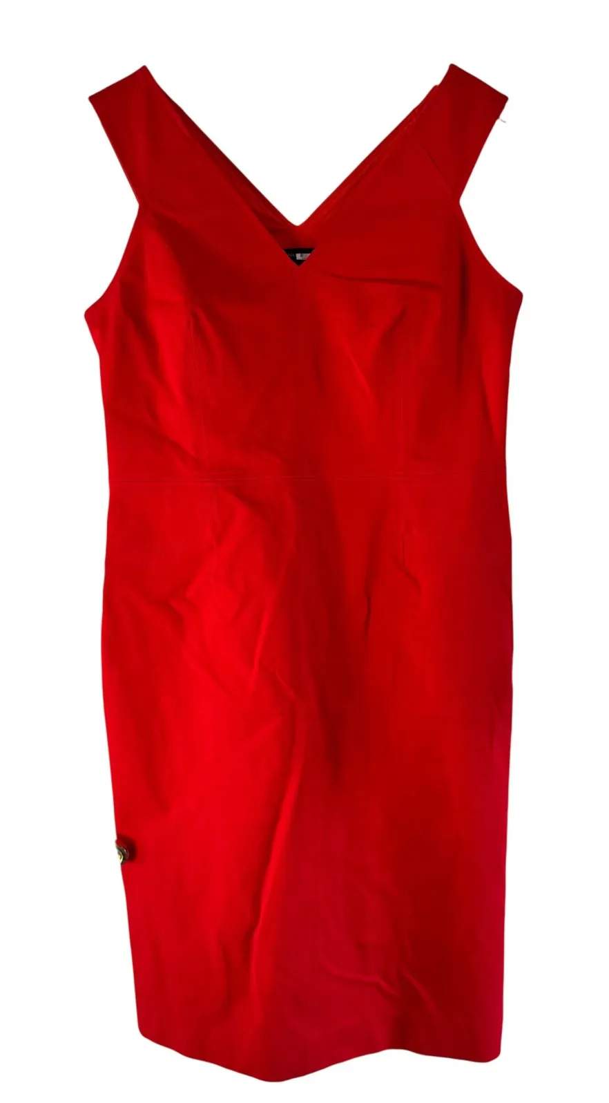 Keywords: Banana Republic, sheath dress, red dress, sleeveless dress, v-neck dress, career dress, cocktail dress, party dress, women's dress, size 14, lined dress, classic dress, fitted dress, midi dress