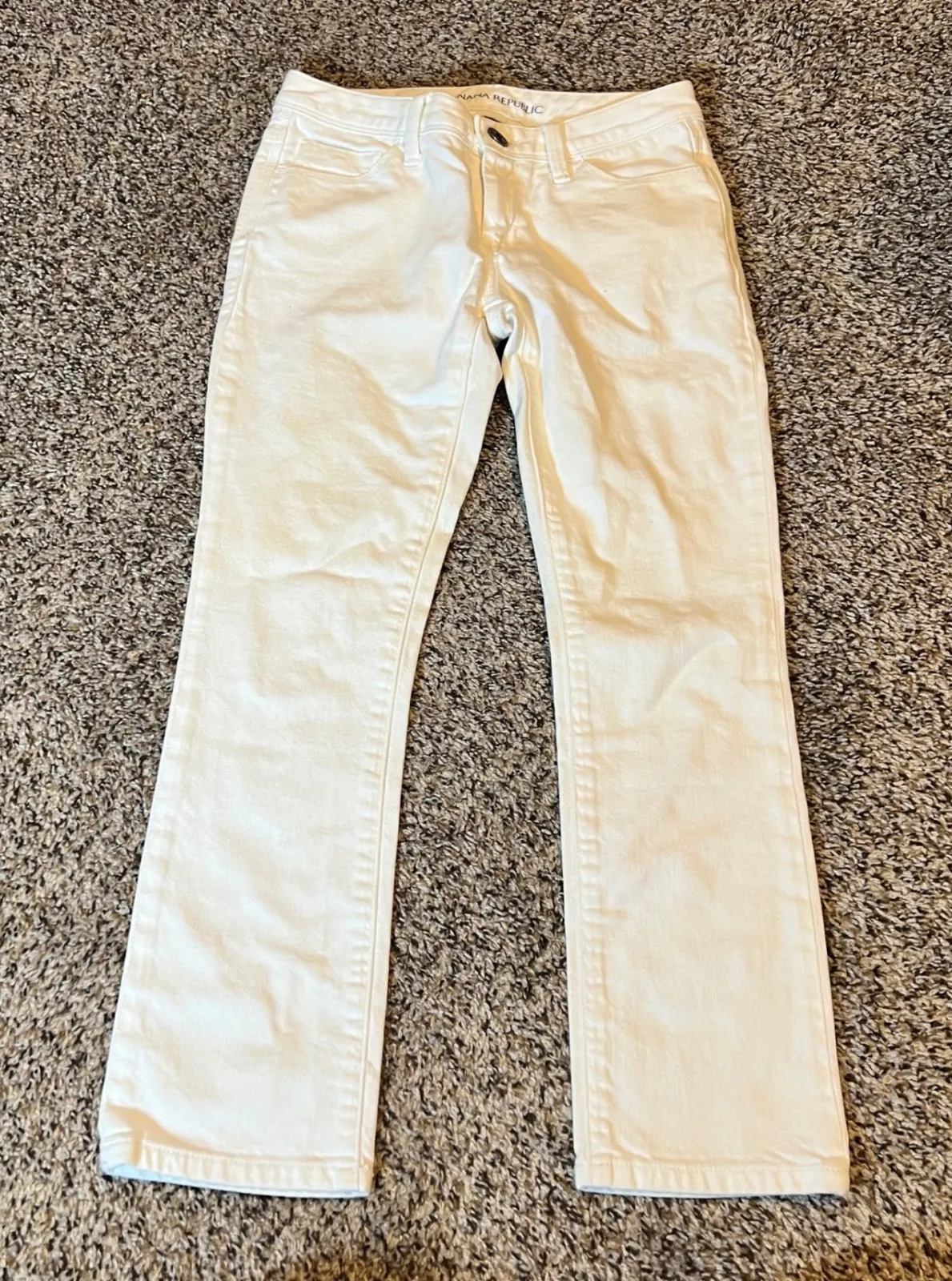 Banana Republic white skinny bootcut jeans. These stylish pants offer a classic five-pocket design w... Show more