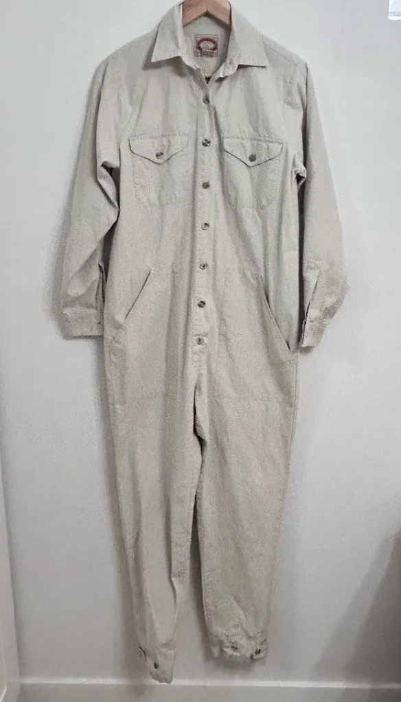 Vintage 1983 safar style khaki jumpsuit size small Missing one button on left sleeve as shown other... Show more