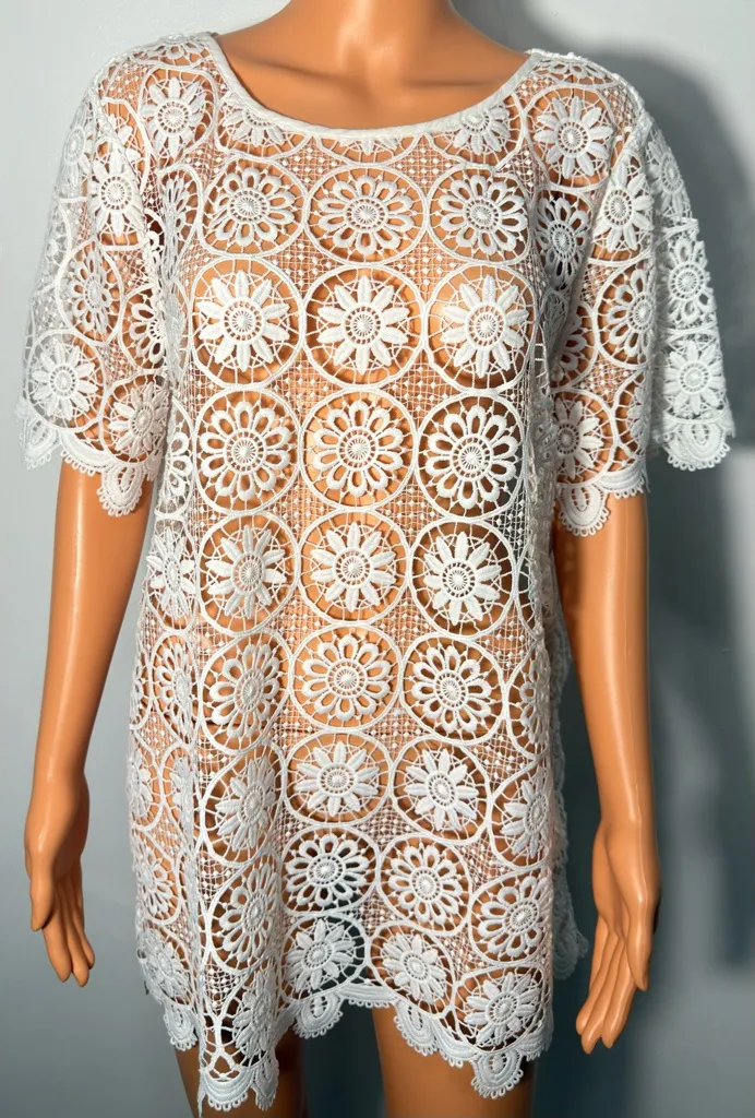 Chic crochet design with floral patterns. Ideal for beach or poolside wear. Lightweight and stylish.