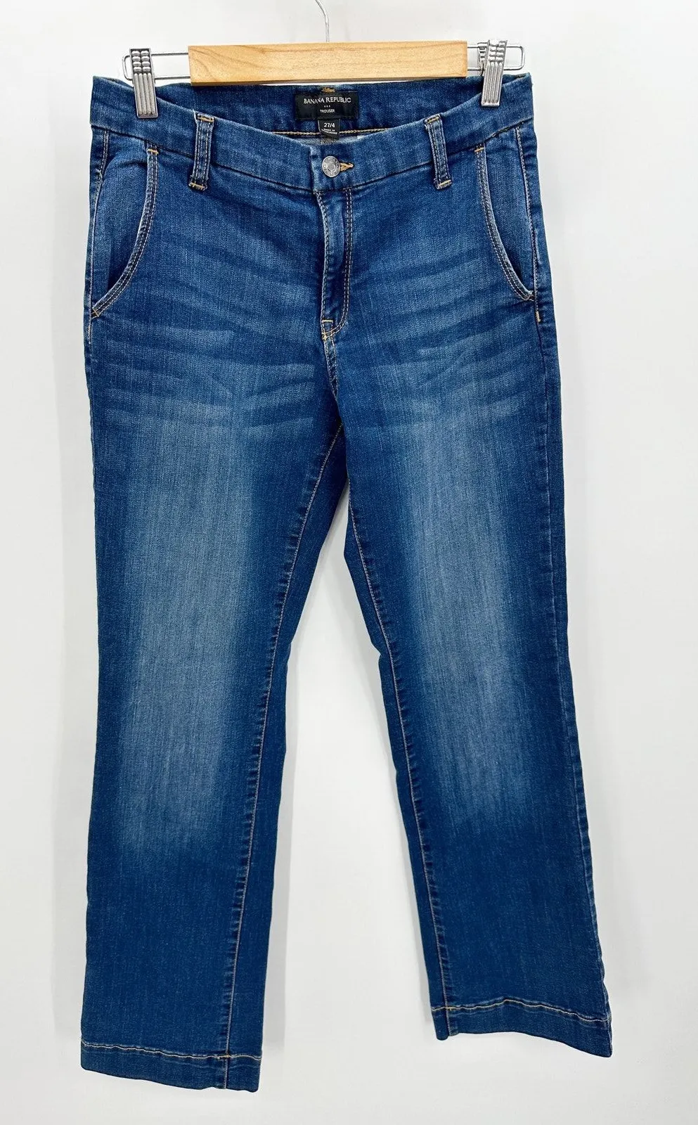 Medium wash blue denim trouser jeans. Cotton blend denim, button closure, pockets. Size: 27/4 Con... Show more