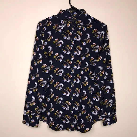 Excellent condition. 100% Polyester. Navy blue with pink, brown, green, red, and white feather and... Show more