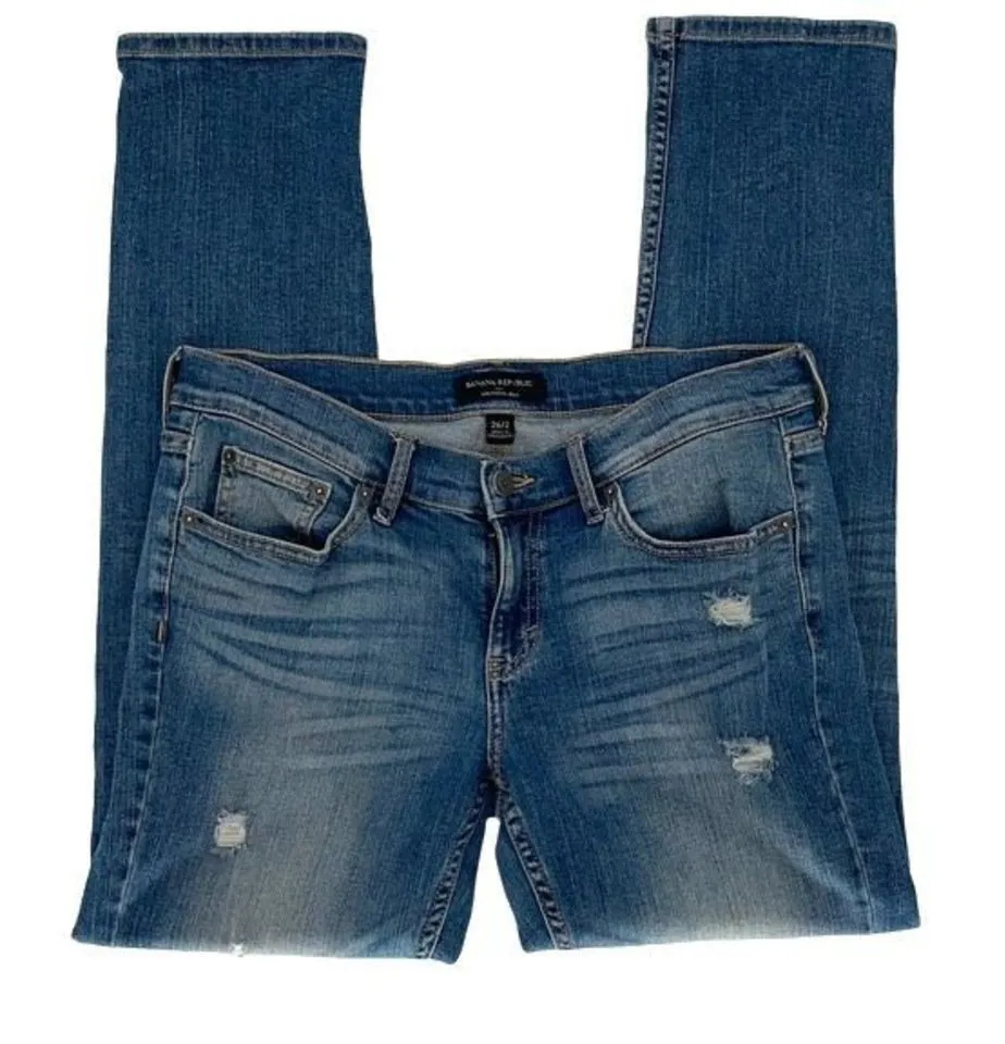 Description: Banana Republic Women's 5 Pocket Styling Belt Loops Mid-Rise Distressed Straight Leg Je... Show more