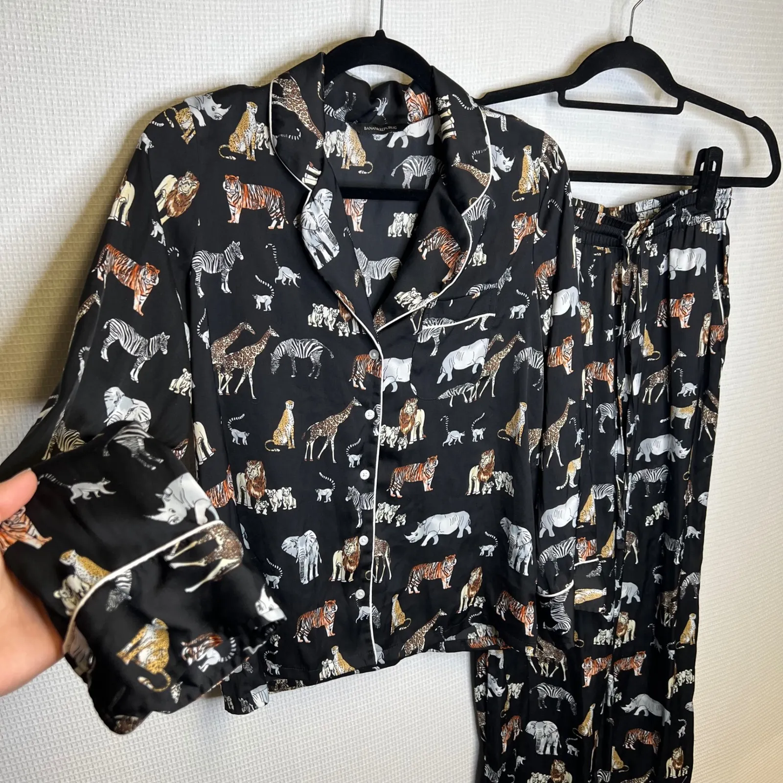 Banana Republic pajama set featuring a playful safari animal print on a black background. The set in... Show more