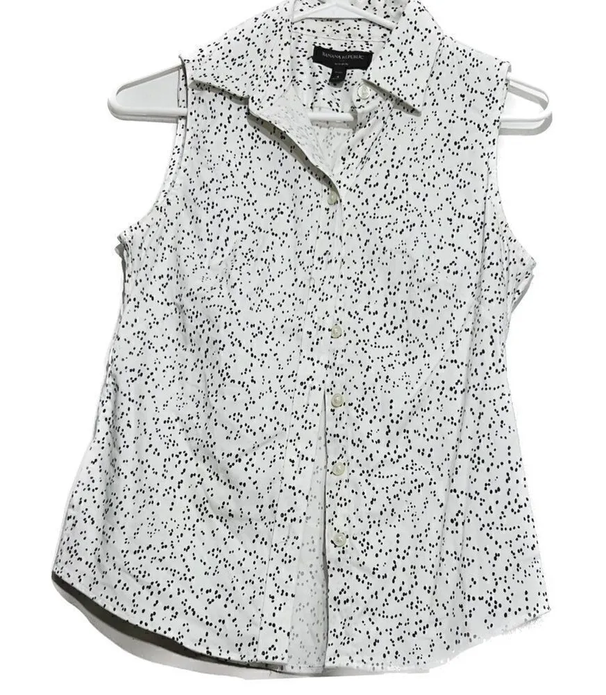This top is in great preowned condition. It is a full button up/down front. It is dalmatian print/po... Show more