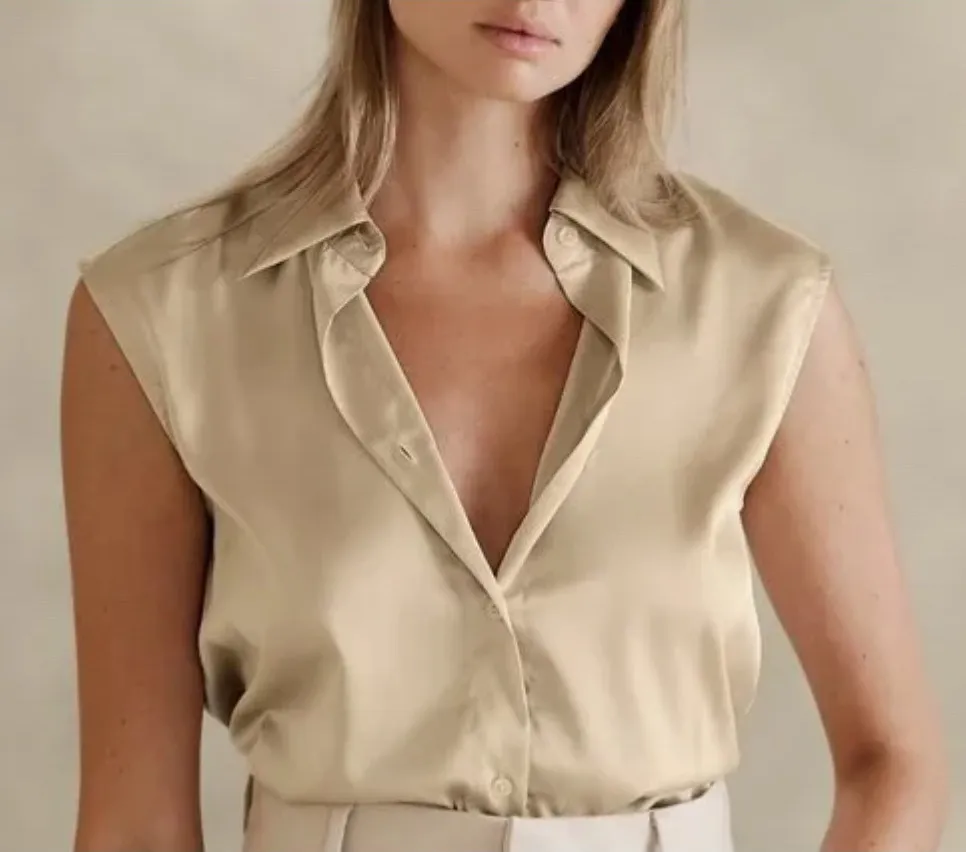 A chic beige sleeveless collared button-down shirt from Banana Republic. This elegant top offers a s... Show more