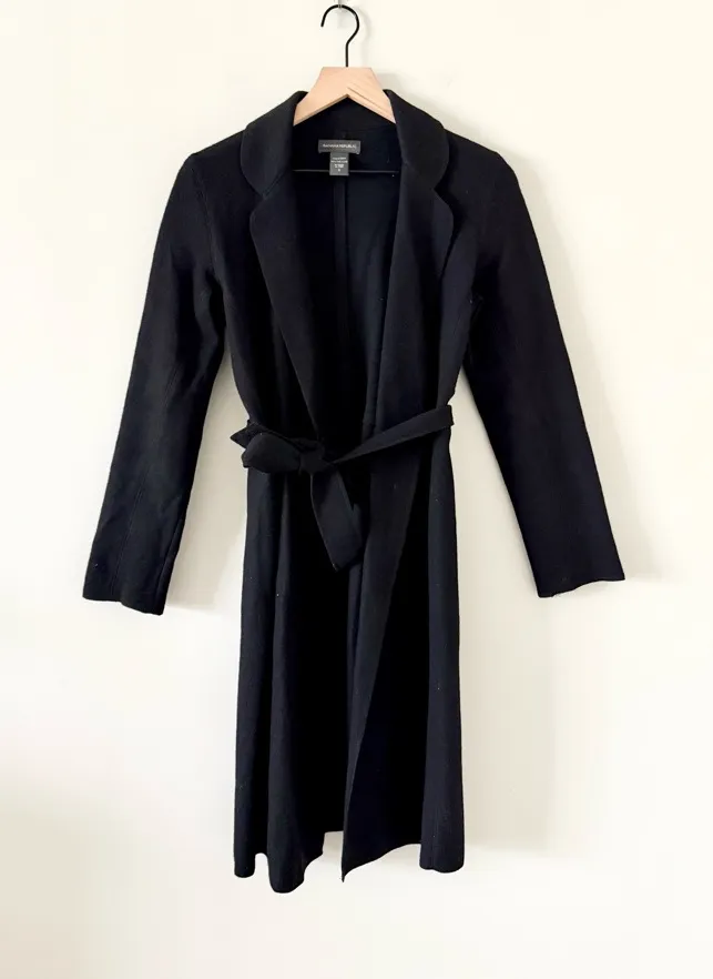 Excellent preowned condition Size S Unlined Felted wool Removable belt Stylish charcoal jacket wit... Show more