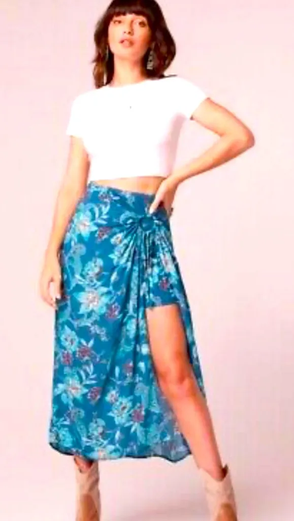 BOG Collective, Band of the Free Deep Teal Floral Celene Multi Layered Side Drape Midi Skirt Large N... Show more