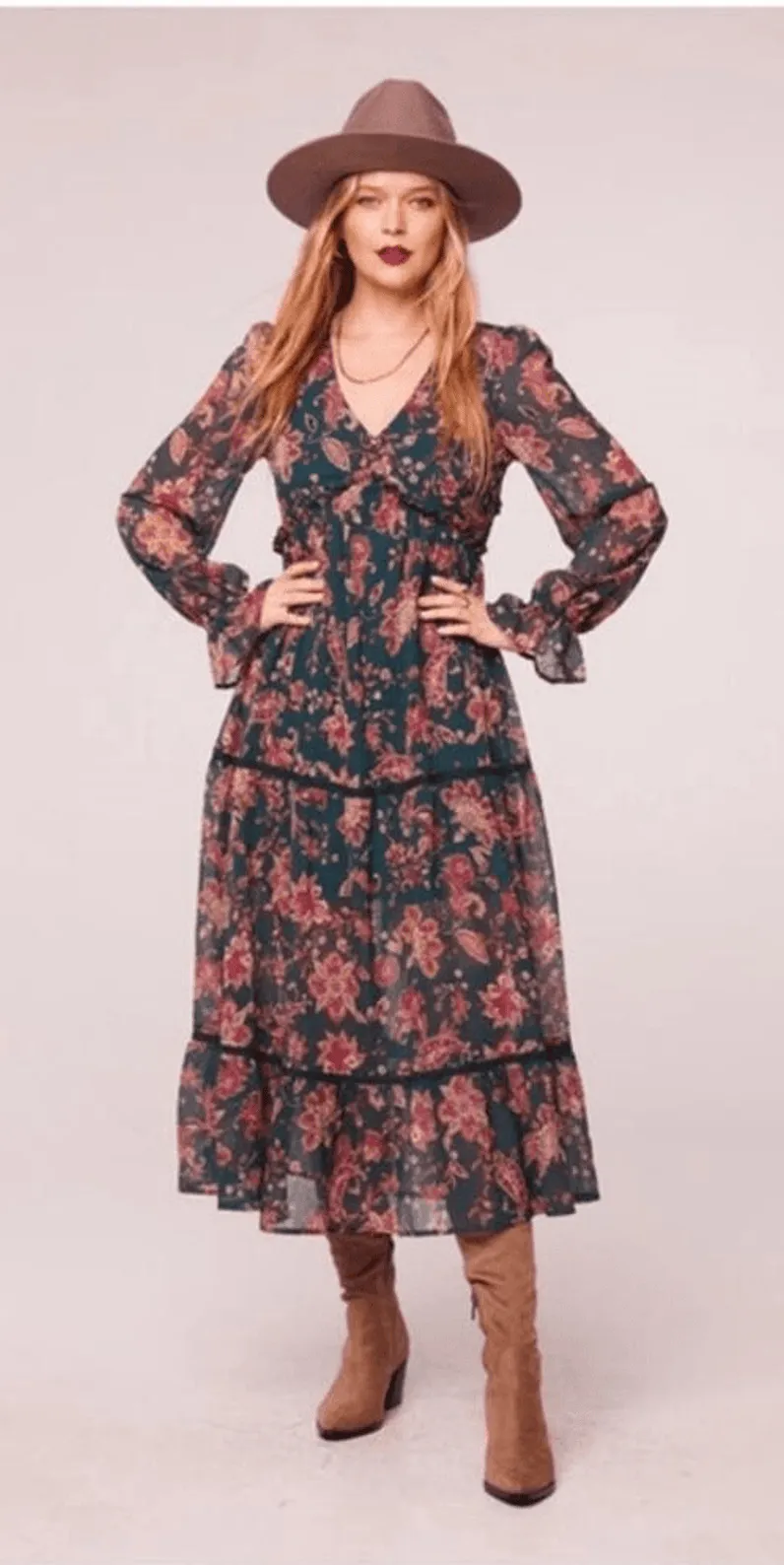 Romantic paisley blooms sweeten our flowy Run the World midi trimmed with soft ruffles and complete... Show more
