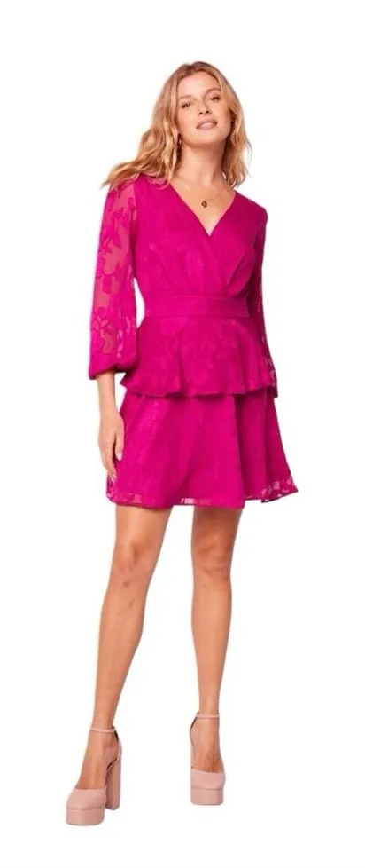 This Band of The Free mini dress in fuchsia is a stunning addition to any wardrobe. The dress features a flattering V-neckline, 3/4 sleeves, and a tie closure at the waist to accentuate your curves. The ruffle and layered accents add a touch of bohemian and retro style, while the lightweight and stretchy polyester material ensure a comfortable fit. Perfect for any occasion, this dress can be dressed up for a party or cocktail event, or dressed down for a casual day out or business meeting. The dress is lined and has an empire waist for added structure. It's a size small and comes in a beautiful pink color that will make you stand out in any crowd. Women ladies junior teenager see pictures for measurements new with tags Offers welcome.Bundle and save! Smoke free pet free home. Ships out next business day Thank you for checking out my closet 45