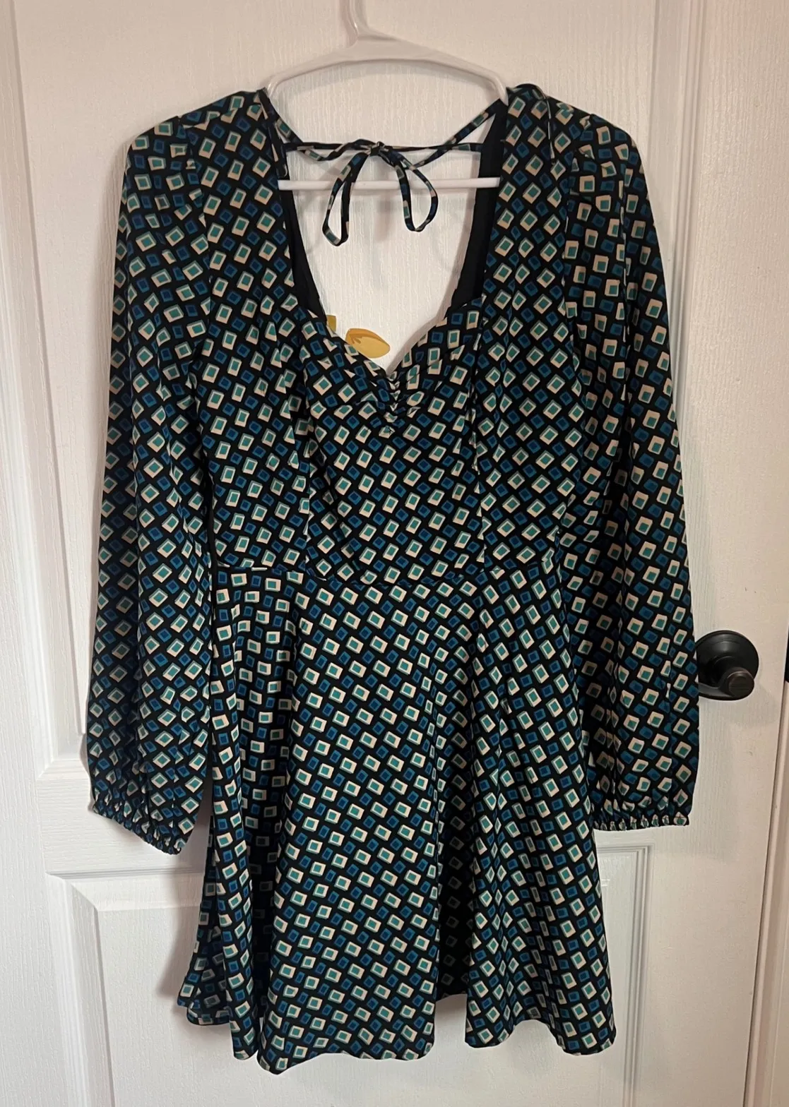 Band of The Free Long Sleeve Mini Dress Smocked Tie Back Geometric Print Party Dress A playful silhouette awaits with this charming mini dress. The geometric print in shades of teal, blue, and cream creates a visually appealing pattern. The dress features long sleeves with elasticated cuffs, a flattering smocked bodice, and a tie-back detail that adds a touch of allure. The mini length and fit-and-flare shape make it perfect for dancing the night away. Imagine yourself wearing this dress to a casual brunch with friends, a garden party, or a fun night out. Style: A-Line, Mini, Fit & Flare Dress Length: Short Color: Blue Department: Women Sleeve Length: Long Sleeve Pattern: Geometric Occasion: Casual, Party/Cocktail Material: Polyester Neckline: V-Neck Fabric Type: Chiffon Character: Boho Chic, Bohemian Season: Spring, Summer, Fall Sleeve Type: Balloon Sleeve Closure: Tie Size:XS Keywords: mini dress, long sleeve dress, geometric print, tie back dress, smocked dress, fit and flare dress, party dress, casual dress, women's fashion, dress, teal dress, blue dress, cream dress, boho dress, bohemian dress Measurement laying flat approximate: Sleeve: 22.5 in Length: 32.5 in Chest (Pit to Pit): 14 in Shoulder to Shoulder: 12 in Ships 1-3 business days after purchase Comes from a pet free/ smoke free environment Please feel free to reach out to me if you have any questions. SKU: 904J-15