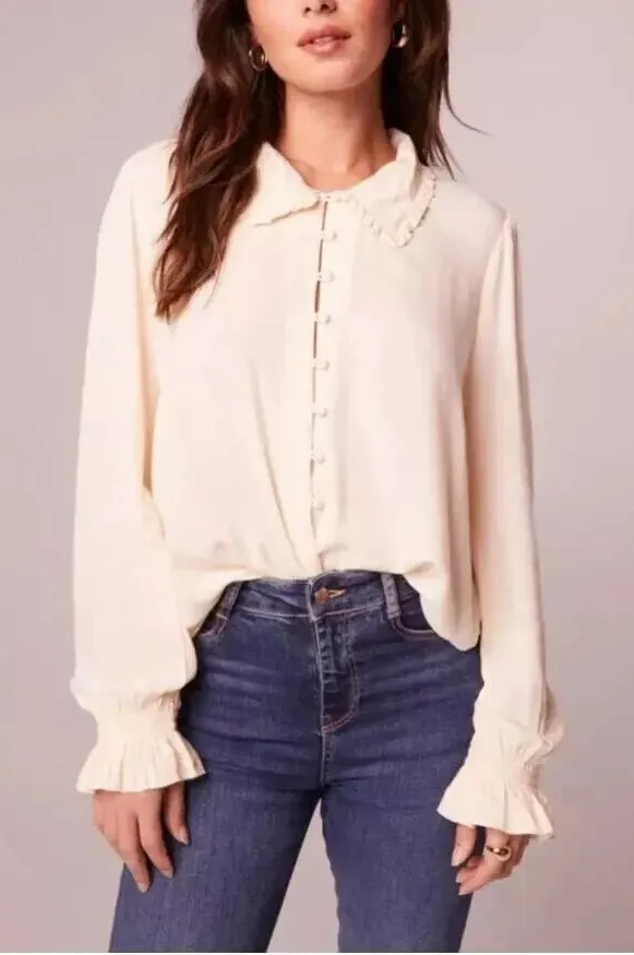 Band of the Free Womens Denise Cream Long Sleeve Button Down Shirt Size Medium This long-sleeve blouse features a ruffle collar design and button-down front, blending timeless elegance with casual comfort for versatile wearability. • Button-Down Closure • Ruffle Collar Detail • Long Sleeves With Elastic Cuffs • Lightweight And Breathable Fabric • Tag Attached For Brand Authenticity Brand: Band of the Free Color: Cream Department: Women Size: Medium Style: Button Up Type: Blouse Features: ruffle, casual, lightweight, breathable, comfy Measurements laying flat approximate: Sleeve: 27 in Length: 29 in Chest(Pit to Pit): 19 in Shoulder to Shoulder: 15 in Ships 1-3 business days after purchase Comes from a pet free/ smoke free environment Please feel free to reach out to me if you have any questions. SKU: 904H-34