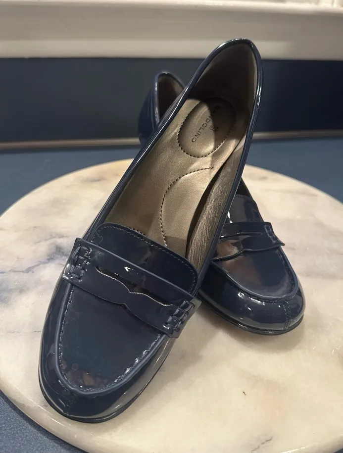 Casual or business attire navy blue patent leather loafers. Sleek and stylish design. Perfect for ve... Show more