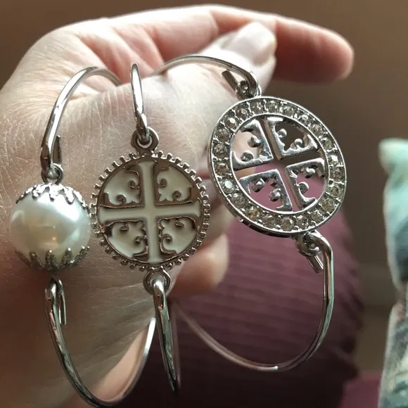 Beautiful bangle bracelets in a set of three. Featuring sparkling rhinestones, and faux pearl set in silver tone. Can be worn individually or can be intermixed. Goes with everything, from casual to dressy styles! Worn once like brand new 10-10 condition.