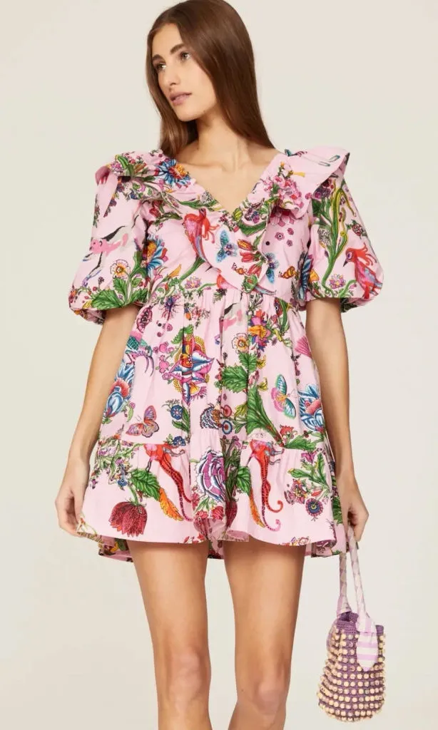 Pink cotton Blouse dress V-neck. Short sleeves. Back zipper closure. Ruffles Puffy sleeves Elastic at waistband Pockets! 100% Cotton Approx measurements laying flat Pit to pit 20.5” Waist 15” Length 33" from shoulder to hemline No flaws. Worn once. Dry cleaned.