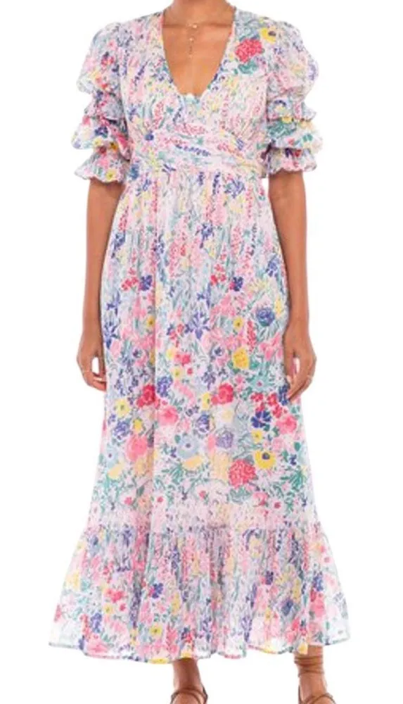 Midi Dress V Neckline Slight Puffy Shoulder Elbow-Length Sleeve, Elastic on the Sleeves Side Pockets Zipper on the Side Lined Fit-and-Flare Silhouette All-Over Novelty Floral Print Midi Length 100% Organic Cotton Size medium Excellent condition 19.75” pit to pit 15.85” waist 52” length (18)