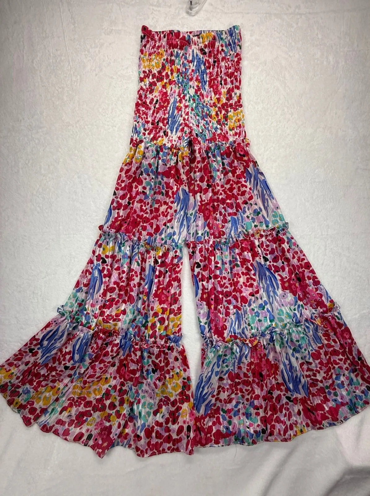 Color: Multicolor Department: Women Character Family: Bohemian Fabric Type: Crepe Material: Polyester Pattern: Floral Character: Bohemian, Festival, Spring, Summer, Colorful Occasion: Casual, Party/Cocktail, Travel Number of Pieces: 1 Piece Keywords: Banjul, Wide Leg, Floral Print, Smocked, Ruffle Tiered, Bohemian, Festival, Summer, Spring, Colorful, Polyester, Lightweight, Size S, Small, beachy, resort wear, boho chic, festival Thank you for viewing my listing! Please see the photos for a detailed look at its CONDITION and MEASUREMENTS. All preowned items have been steam cleaned and/or washed. Feel free to reach out with any questions.