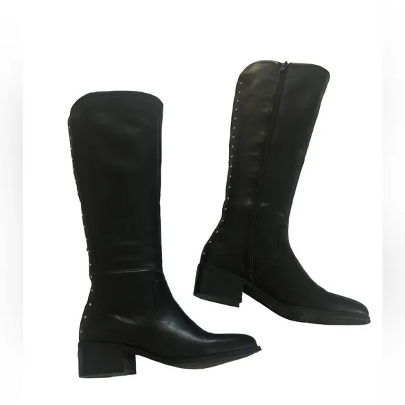 BAR lll VAYLA BLACK PLEATHER VEGAN FAUX LEATHER RIDING BOOTS Inside zip. Stud detail along back of... Show more