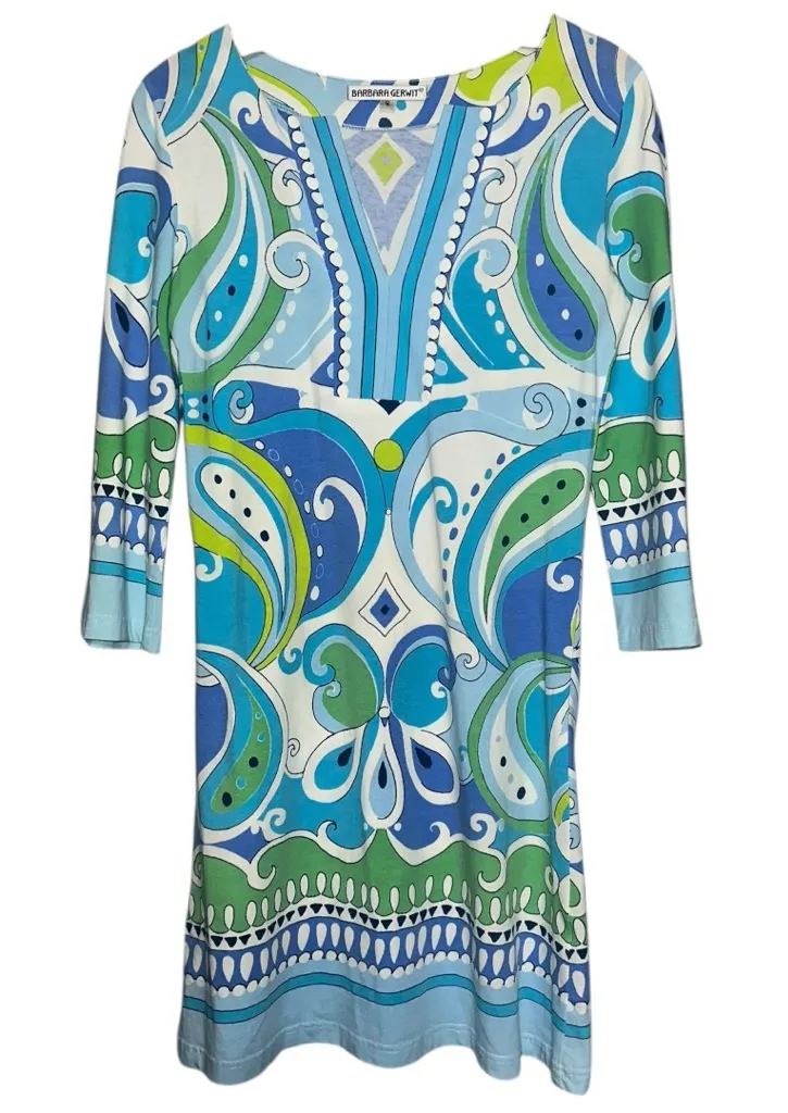 Barbara Gerwit Women’s Size Small Blue White Green Abstract Geo Knit V-Neck Dress. Cotton blend. ▪️ Excellent used condition. ▪️ Measurements are in the pictures ▪️ Items are stored in a pet & smoke free atmosphere. ▪️ We do not operate in a scent free environment. ▪️ Colors shown on-screen can vary from computer to computer. I make every effort to photograph each item individually and list with accuracy. ▪️ Classic, timeless, travel, weekend, vacation, everyday, easy, versatile, iconic, resort, sporty, laidback, effortless, throw on and go, comfortable, casual, work, wear, event, special occasion, social, show, gathering, errands, leisure, basic, essential, staple, function, statement, flattering, baby, bridal, shower, feminine, romantic, boho Thank you XOXO - Ro