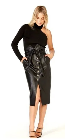Bardot Black Faux Leather Tie Waist Skirt Please NOTE: this skirt runs one size small. I’m a size 8 and it was too tight. It would fit a size 6 ~ high waist paper bag silhouette ~ asymmetrical gold-tone buttins, top half are functional, bottom half are decoration only. ~ front slit at hem ~ matching belt ~ pencil skirt ~ back zipper ~ excellent condition Size: fits a 6, NOT an 8 Length: side to hem: 29”, top tip is another 2” Waist: 30” Hips: approximately 36”