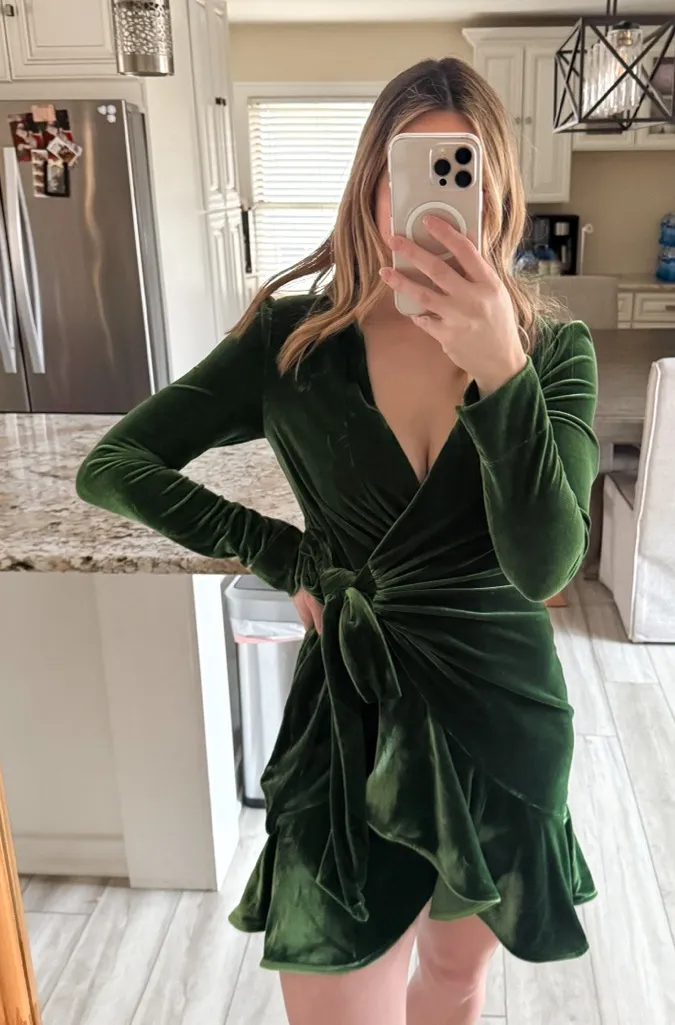 Size Medium (AU 10 / US 6 / EU 38). Rich emerald green Bardot velvet wrap dress featuring a deep V neckline, long fitted sleeves, and a flattering wrap silhouette with an adjustable side tie. Soft velvet fabric with a slight stretch creates a body-skimming fit, finished with a feminine ruffled hem for movement and shape. Perfect for holiday events, weddings, date nights, or special occasions. Excellent condition with no stains, holes, or visible wear.