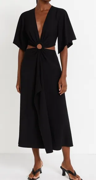 size 6. Deep V-neck plunge, short kimono sleeve with cut out, midi skirt with back zip closure. No s... Show more