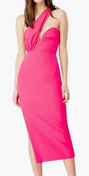 The Lorella dress is fitted in a structured sheath silhouette that lightly grazes the curves and falls to a midi length. With a plunge sweetheart neckline, a one-shoulder draped overlay adds textural depth to an otherwise modest evening dress. One-shoulder Back zip Lined Polyester/elastane Hand wash Imported