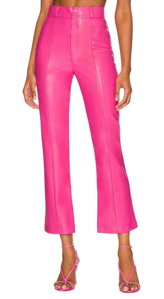 There’s a new colour in our popular vegan leather range, and if you’re ready to ditch the trackies, these hot pink pants are for you. In our signature flattering fit, the pants come to just above the ankle and feature only centre-front seams as design details, allowing colour to make the maximum impact. Self: 100% polyurethane Lining: 100% poly Hand wash Zip fly with snap button closure Belt loops Faux leather fabric with seaming detail Item not sold as a set 14.5" at the knee and 14.5" at the leg opening Revolve Style No. BARD-WP44 Manufacturer Style No. 55941PB2 Color: Pink MSRP:$98.00 Product measurements Inseam 27.0" Rise 14.5" Knee Opening 14.5" Leg Opening 14.5" Size: Womens 6 Measurements taken flat across, Hips 17 in / 43 cm Length 39 in / 99 cm Waist 15 in / 38 cm Condition: New With revolve partial tag, scratch at upper leg, did not go through Tags: night out, party, event, date night, pants, bottoms, designer, fashion, work, office, business, professional, pleated, soft, buttery, fall, winter, vegan, faux leather, pleather, trousers, shiny, metallic, rush, sorority, designer, barbie, barbiecore