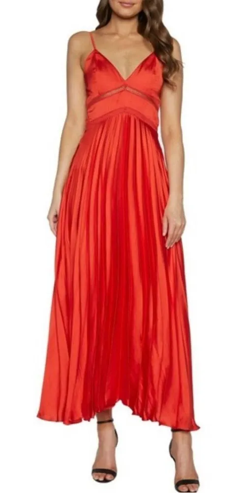 A stunning, high-impact formal dress designed to turn heads. Crafted from soft-feel premium satin, this dress features a fitted bust with delicate lattice detail, adjustable shoulder straps, and a dramatic pleated skirt that moves beautifully with every step. Perfect for your next formal event, wedding, gala, or holiday celebration. Features: • Fitted bust with lattice detail • Adjustable shoulder straps • Flowing pleated skirt • Satin sheen finish • Fully lined • Zip-back closure • Fabrication: 100% Polyester Condition: Excellent, pre-loved Size: 4 Color: Red (ruby red, vibrant) formal dress, satin gown, red dress, ruby red, bardot dress, pleated gown, midi maxi dress, wedding guest dress, black tie, gala dress, prom dress, homecoming, evening gown, bridesmaid dress, cocktail dress, special occasion dress, holiday party dress, event dress, opera night, date night, birthday dress, ball gown, pageant dress, dinner party, luxury satin dress, Valentine’s Day dress, holiday, NYE, new year, New Year’s