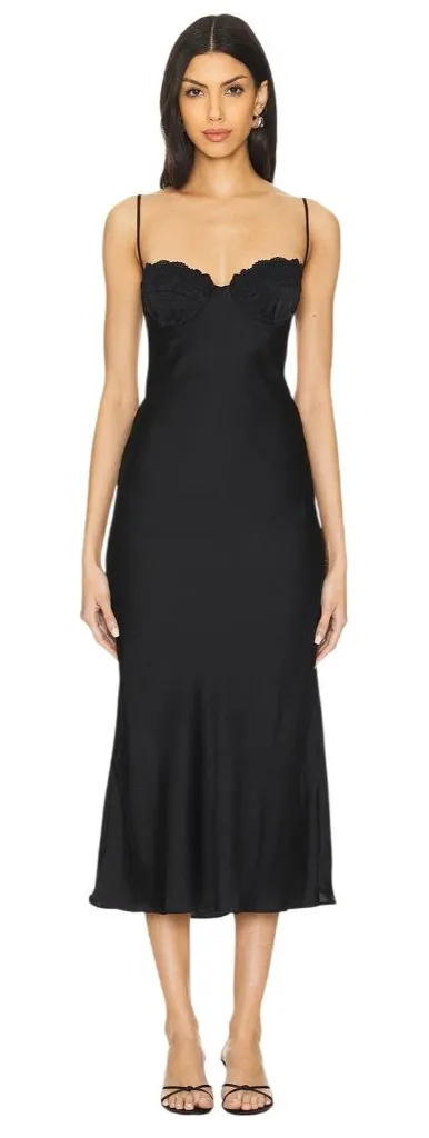 After-hour opulence. The Sabina Midi Dress is made from a smoothing fabrication with a subtle sheen. It features a sultry bodice-style top with dyed-to-match lace detailing across the bust, slim straps, an open back and concealed zip closure. Self: 100% polyester Lining 1: 100% polyester Lining 2: 100% polyester Mesh: 92% nylon, 8% elastane Lace: 90% nylon, 10% elastane Hand wash Fully lined Hidden back zipper with hook and eye closure. Adjustable shoulder straps Open back with clasp closure Unpadded underwire cups with floral lace trim Satin fabric Revolve Style No. BARD-WD795 Manufacturer Style No. 59209DB Color: Black MSRP:$139.00 Features: • Currently on Revolve but sold out in this size Size: Womens 12 Measurements taken flat across, Bust 18 in / 46 cm Hips 21 in / 53 cm Length 54 in / 137 cm Waist 17 in / 43 cm Condition: New With revolve partial tag tags: classy, chic, holiday, fall, winter, Christmas, cocktail, dressy, date night, new, NYE, party, Black tie, ssense, farfetch, designer, layered, LBD, column, longline,
