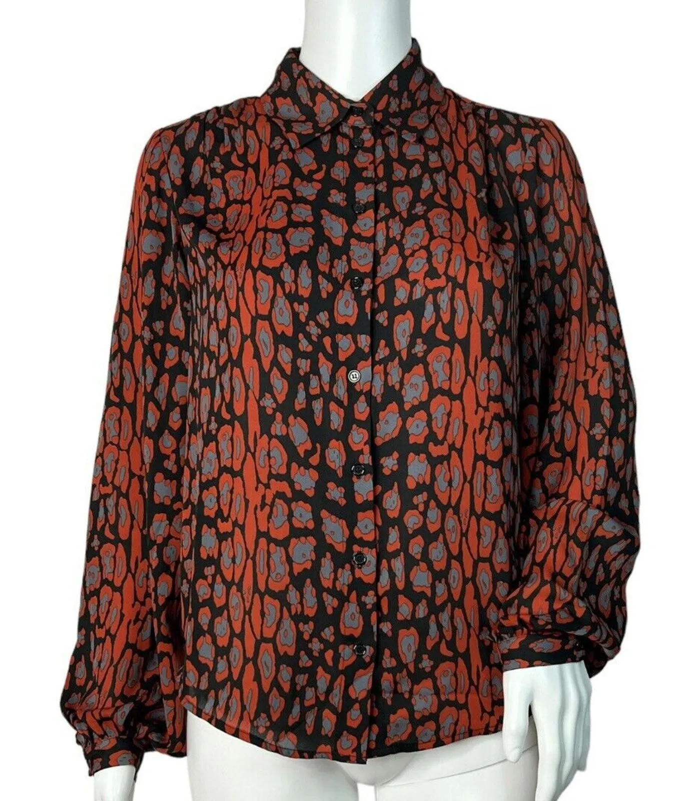 Bardot Shirt Womens 4 Red Black Gray Mona Leopard Blouse Edgy Chic Bohemian Women's Size 4 Long Sleeve Balloon Sleeve Button Up Collared Neckline Flowy 100% Polyester Boho Chic Y2K Retro Effortless Sophisticated Work Office Wear Layering Night Out Date Night Statement Piece Street Style Minimalist Luxe Parisian Style Grunge Glam Measurements are Approximate: Length 23” Armpit to Armpit 19” New with Tag (3141)