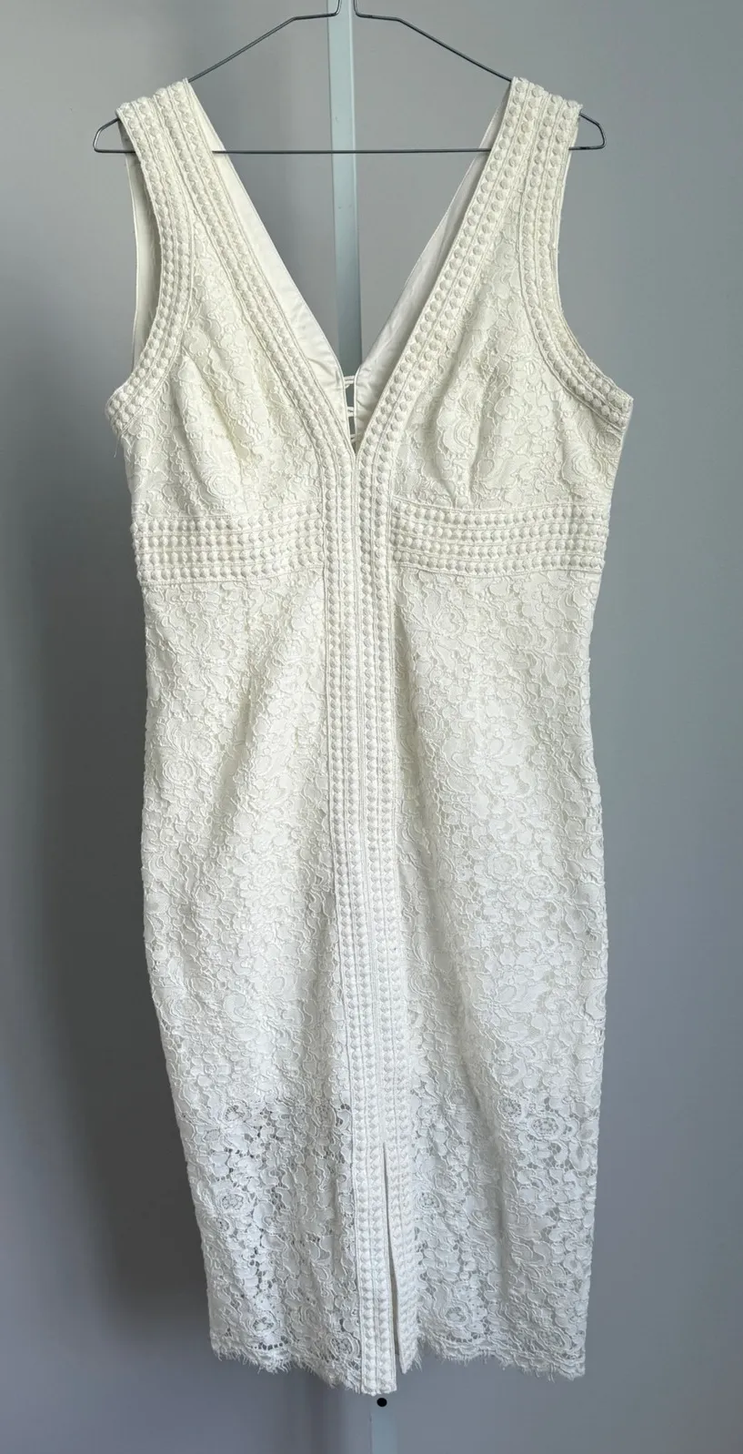 Bardot White embroidered midi cocktail dress luxury party knee length size M Gently used with no flaws. Exquisite white lace dress by Bardot, designed to captivate with its intricate details. The dress is sleeveless, offering a chic and airy feel, perfect for warmer weather. Delicately patterned lace covers the entire dress, creating a sophisticated and feminine aesthetic. The design includes refined trim and an elegant vertical panel detail, adding depth and visual interest. A discreet zipper ensures a seamless fit. Keywords: Bardot dress, white lace dress, sleeveless dress, sheath dress, cocktail dress, party dress, V-neck dress, midi dress, women's dress, lace dress, bodycon dress, Bardot, dress, white, lace Measurements: Pit to pit: 18" Waist: 32" Hips: 42" Length: 41.5" Weight: 15 oz SKU: YY07